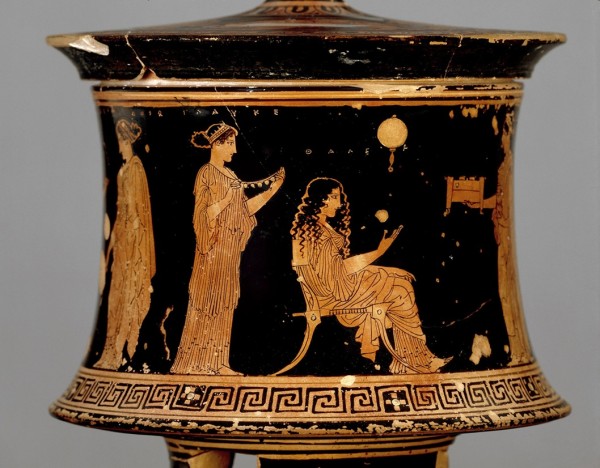 Výjavy z každodenného života žien, vyplnené detailmi predmetov, ktoré ich obklopovali, sú zachytené v červenofigúrovom vázovom maliarstve. Vyobrazenia na keramike nám taktiež poskytujú informácie o ženskom odeve a účesoch. Napríklad tzv. Maliar z Eretrie, tvoriaci medzi rokmi 440-415 pred Kr., znázornil na pyxide (malá škatuľka, používaná napr. na odkladanie šperkov) niekoľko ženských postáv, nachádzajúcich sa v interiéri domu. Pravdepodobne ide o scénu zachytávajúcu strojenie nevesty pred svadobným obradom.