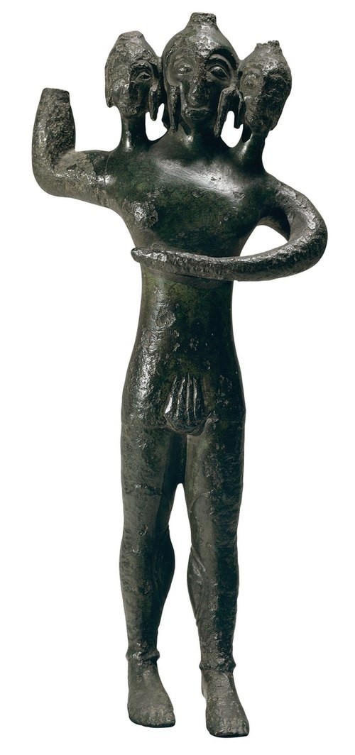 Hésiodos spomína cestu Hérakla „na kraj sveta“ na ostrov Erytheia, aby získal dobytok ukradnutý trojhlavým obrom Géryónom (neskôr sa mu prisudzovalo trojité telo a tri páry rúk a nôh). Rímski autori ako Vergilius a Livius od prelomu letopočtov uvádzali, že Herkules (polatinčená verzia Héraklovho mena) sa na ceste domov zastavil na území neskoršieho Ríma, kde mu na Aventínskom vrchu dobytok ukradol trojhlavý pastiersky obor-ľudožrút Kakos (lat. Cacus). Svoj úlovok odtiahol do hlbokej jaskyne, ktorej vchod zavalil veľkým balvanom, Herkules ho ale napokon našiel a uškrtil. Rímsky historik Marcus Verrius Flaccus (55 pred n. l. – 22 n. l.) namietol, že hrdinom príbehu pôvodne nebol Grék Herkules, ale mocný miestny pastier Garanus. „Evidentne ide o domáci italický mýtus, ktorého hrdina Garanus bol asimilovaný do gréckych príbehov o Héraklovi,“ píše Martin West. Istý Cassius – zrejme rímsky historik Cassius Hermina (2. storočie pred n. l.) ale označil za „pravé meno“ hrdinu, ktorý zabil Kaka, (T)recaranus čiže „trojrohý“. „V Itálii určite ide o starú tradíciu,“ zdôrazňuje nemecký expert na grécku mytológiu Walter Burkert. Okrem iného zmieňuje veľmi starobylé daunské stély [2] z 8. až 6. pred n. l. zo severovýchodu Apeninského polostrova, ktoré zobrazujú trojrohého „Herkula“.